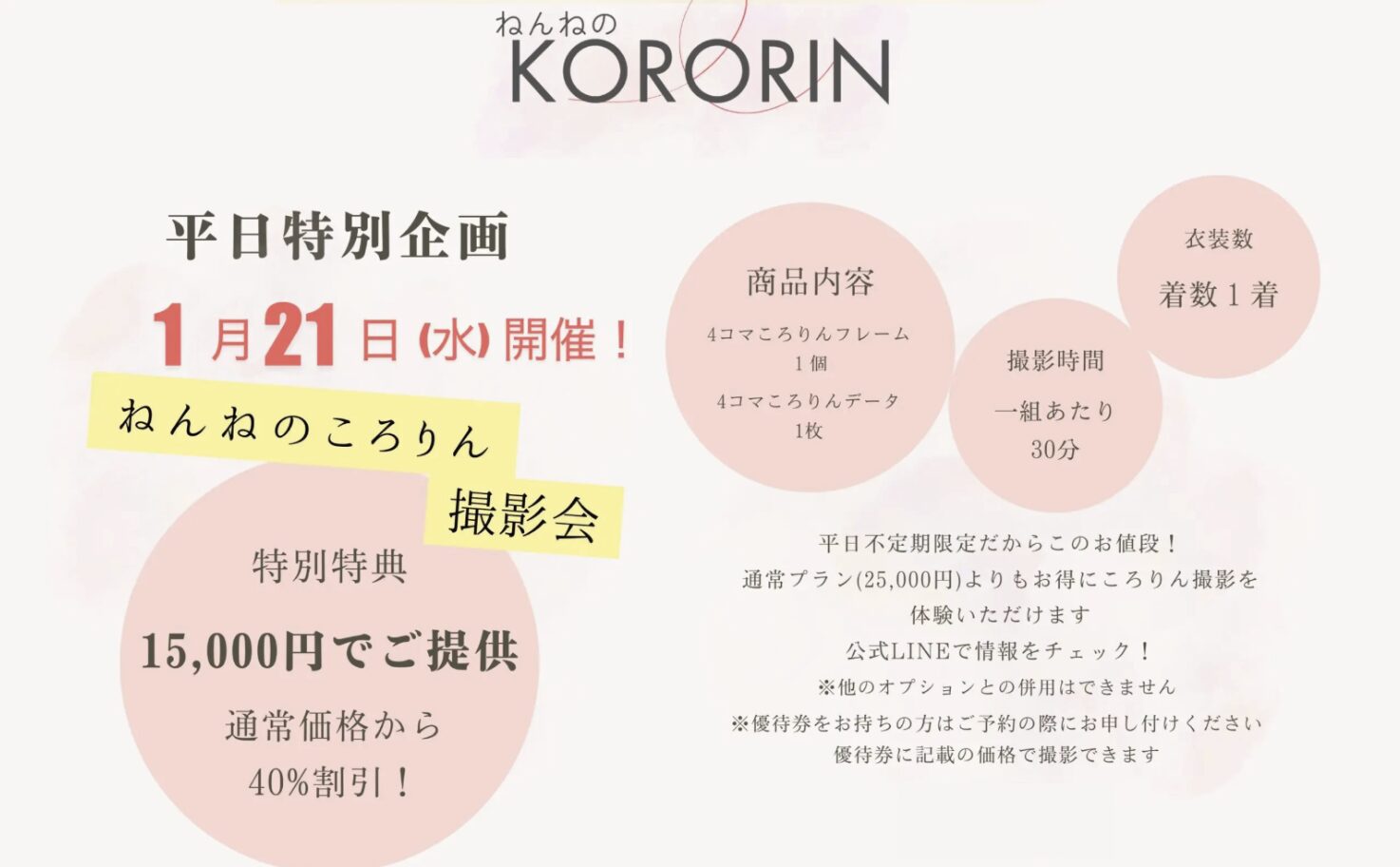 そこで、特に人気の高い「ねんねのころりん撮影」をより気軽に体験していただけるよう、平日だけの特別企画がスタートしました。